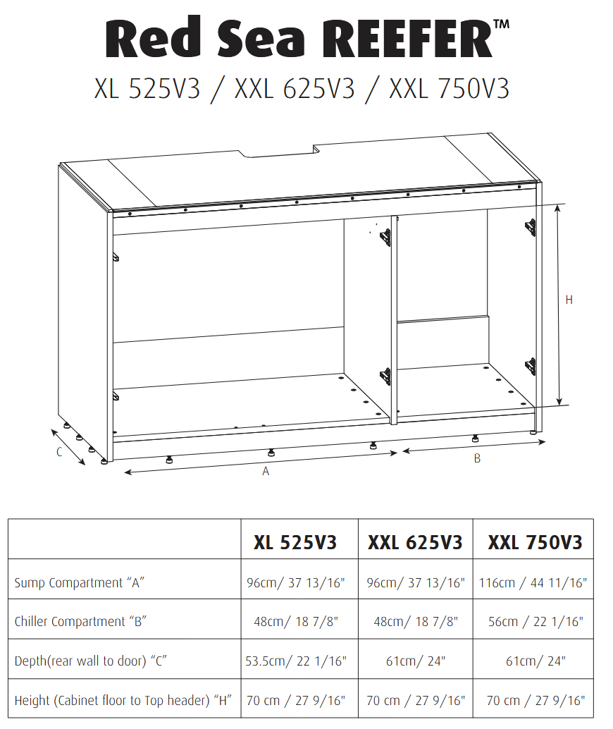 Os aquários REEFER G3 são montados em armários de madeira compensada de especificações marinhas com pés niveladores, com modelos REEFER 525 e acima reforçados com suportes de alumínio frontal.