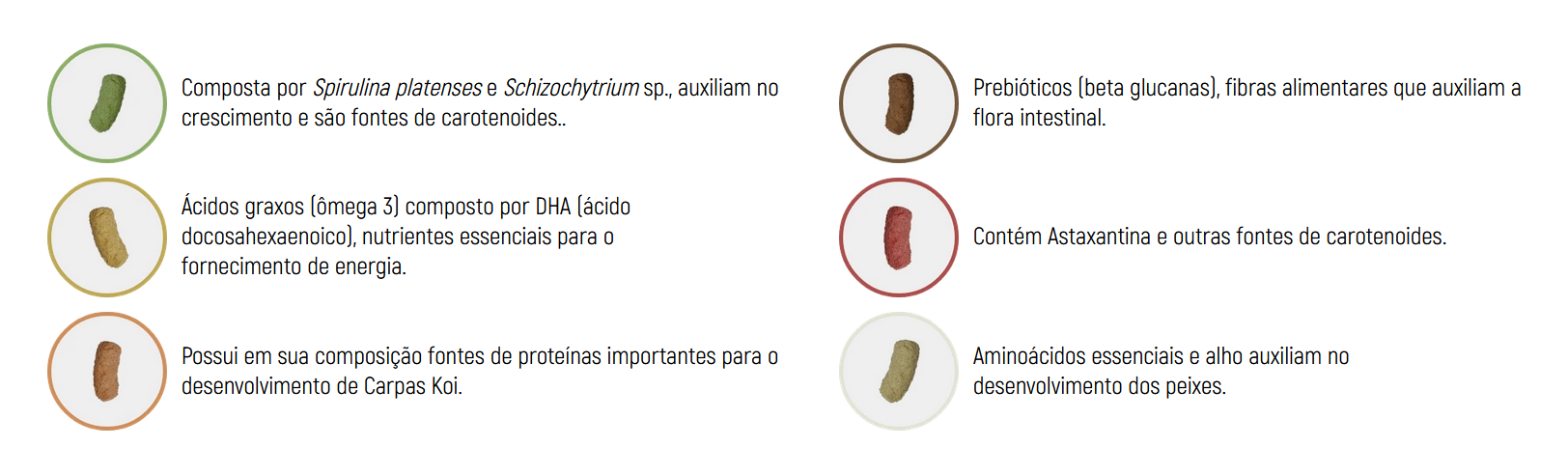Em formato de sticks (13 mm de comprimento e 5 mm de diâmetro), estimula a curiosidade e o apetite, com baixa densidade garantindo uma maior flutuabilidade. As diferentes cores estão baseadas em inclusões de ingredientes, representando as diferentes nutrições e cuidados.