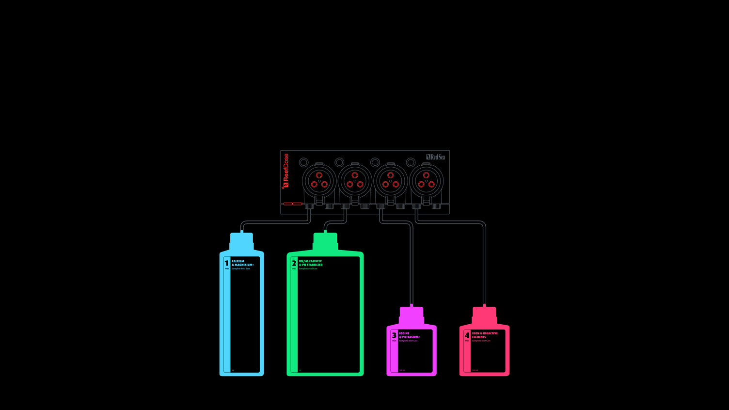 Se você conectar os 4 frascos ao sistema automático (por exemplo Red Sea ReefDose), sua rotina de suplementação fica tão simples quanto possível: ao ajustar a dose diária da Parte 1, o sistema ajusta automaticamente as dosagens das Partes 2-4!